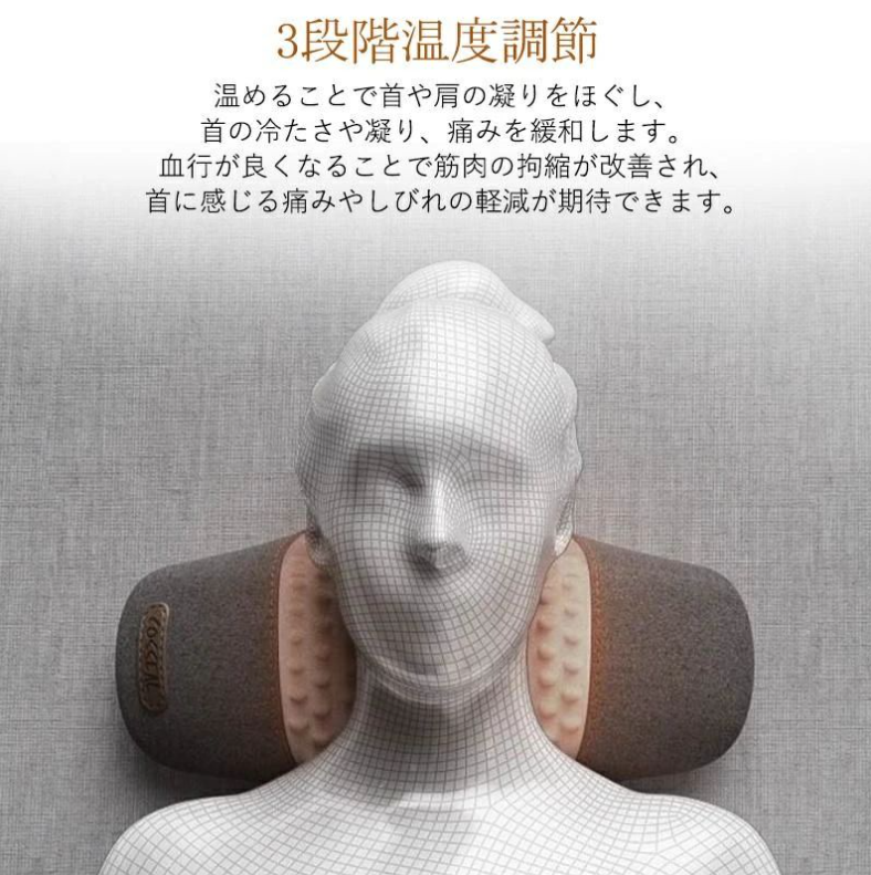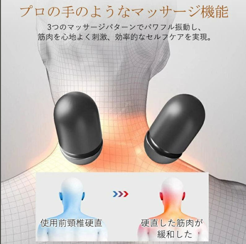説明通りの効果があり、しっかりと温まり、心地よいマッサージもしてくれます。首のこりにとても効いて、大満足です!